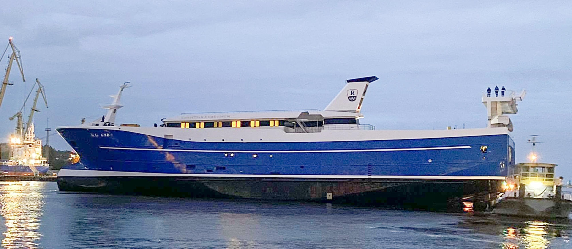 Hósdagin varð skrokkurin til stóra uppsjóvarskipið Christian í Grótinum sjósettur í Póllandi.