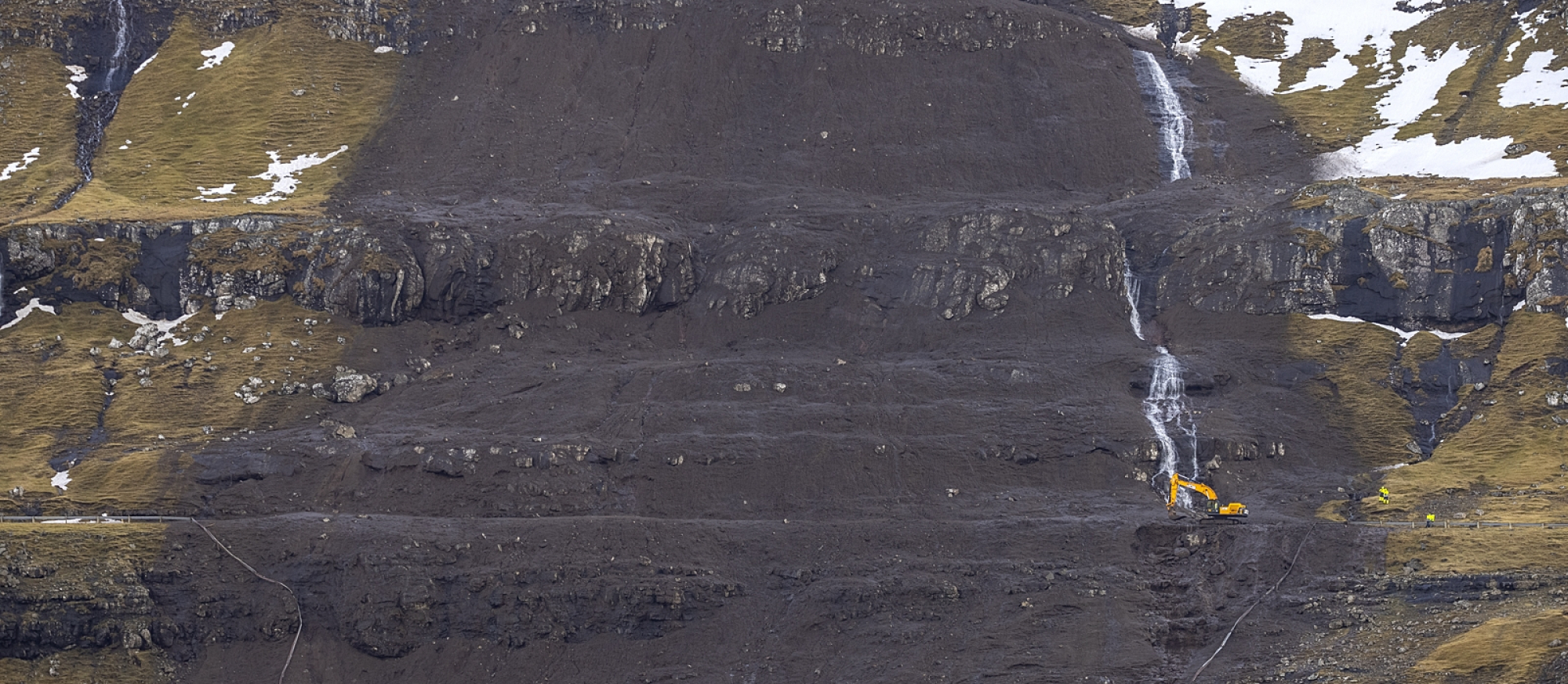 Tað var stórt arbeiði at rudda vegin fyri tilfari. Landsverk hevur mett, at tað lupu um 5.000 rúmmetrar í størru skriðuni og 2.000 í teirri minnu.