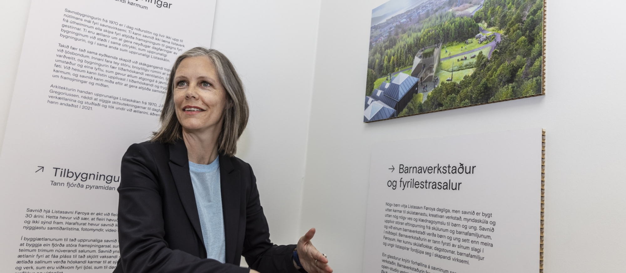 Tað, sum nú sæst á framsýningini, er tekningar av Listasavninum, sum ætlanin er at tað skal síggja út um nøkur ár. Talan er um eina byggiætlan, sum kemur at kosta 60 milliónir krónur. 50 milliónir eru longu fingnar til vega, og vónandi eydnast tað at finna tær seinastu milliónirnar, so at triðja byggistigið í verkætlanini eisini kann gerast veruleiki, sigur Karina Lykke Grand.